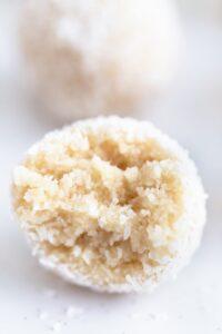 Sin hornear bolas de nieve de coco. Son el postre o merienda perfecto para deportistas, estudiantes y personas que quieren algo dulce elaborado a base