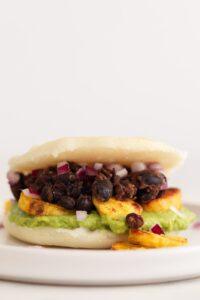Arepas veganas, rellenas con un delicioso relleno de vegetales, a base de frijoles negros, plátano macho y puré de aguacate. Son tan abundantes y extremadamente