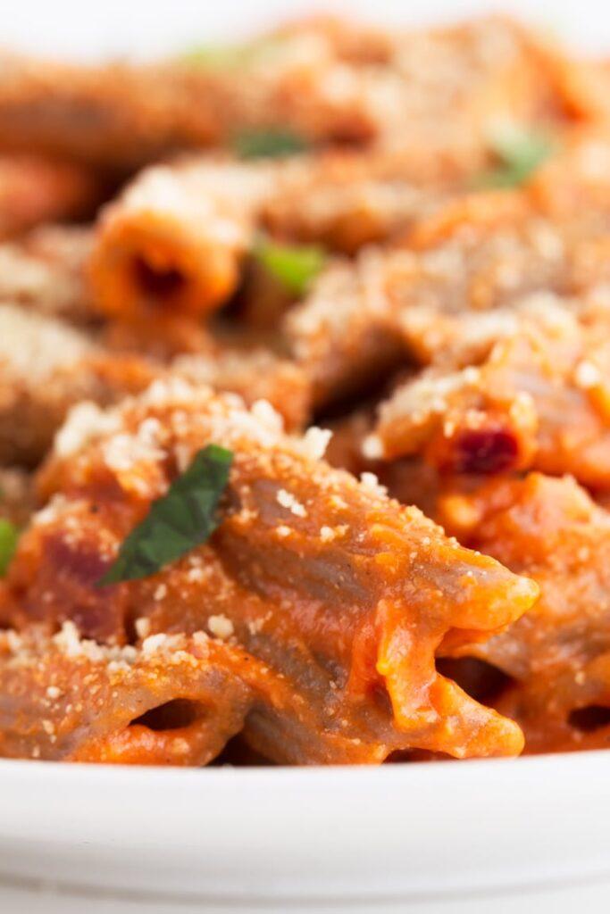 Delicioso y cremoso penne alla vodka vegano, sencilla receta de pasta, elaborada a partir de 9 ingredientes. Sáltate el restaurante y haz una versión a base de plantas en casa.